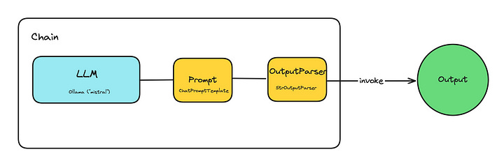 chain = prompt | llm | outputAs you can see, this is very straightforward. You are passing a prompt to an LLM of choice, and then using a parser to produce the output. You are using langchain’s concept of “chains” to help sequence these elements, much like you would use pipes in Unix to chain together several system commands like ls | grep file.txt.