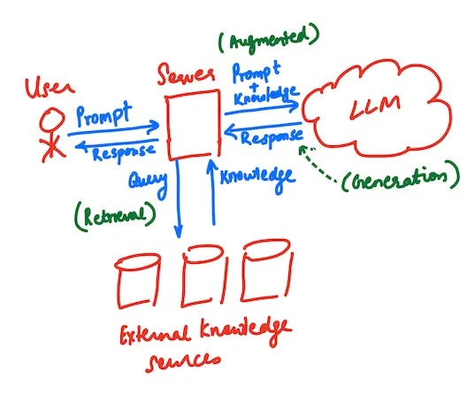 RAG or Retrieval Augmented Generation is a really complicated way of saying “Knowledge base + LLM”. It describes a system that adds extra data, in addition to what the user provided, before querying the LLM. Where did that additional data come from? It could be from a number of different sources like vector databases, search engines, other pre-trained LLMs etc.